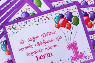 Konfeti ve balon temalı 1 yaş doğum günü Bir yaşına giren Derin’in ilk doğum günü partisi için konfeti ve balon temalı teşekkür kartı ve dilek kartı tasarladık. Neşeli tasarımlarımızın partiye renk kattığını…