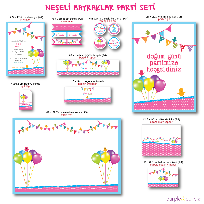 Neşeli bayraklar parti setimiz aşağıda detaylarını belirttiğimiz 10 tasarımdan oluşuyor. Tasarımların tümünü satın alabileceğiniz gibi; sadece istediğiniz tasarımları da seçebilirsiniz. Ya da bu 10 tasarım içinden istemedikleriniz yerine ihtiyacınız olan başka parti ürünü tasarımları da ekleyebilirsiniz. Her bir tasarım A4 veya A3 sayfasına en fazla adette sığacak şekilde yerleştirilip pdf dosyası formatında mail ile gönderilir.