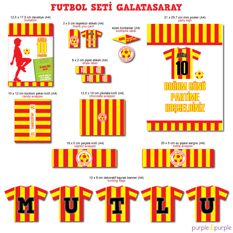 Galatasaray temalı futbol parti setimiz aşağıda detaylarını belirttiğimiz 10 tasarımdan oluşuyor. Tasarımların tümünü satın alabileceğiniz gibi; sadece istediğiniz tasarımları da seçebilirsiniz. Ya da bu 10 tasarım içinden istemedikleriniz yerine ihtiyacınız olan başka parti ürünü tasarımları da ekleyebilirsiniz. Her bir tasarım A4 veya A3 sayfasına en fazla adette sığacak şekilde yerleştirilip pdf dosyası formatında mail ile gönderilir.