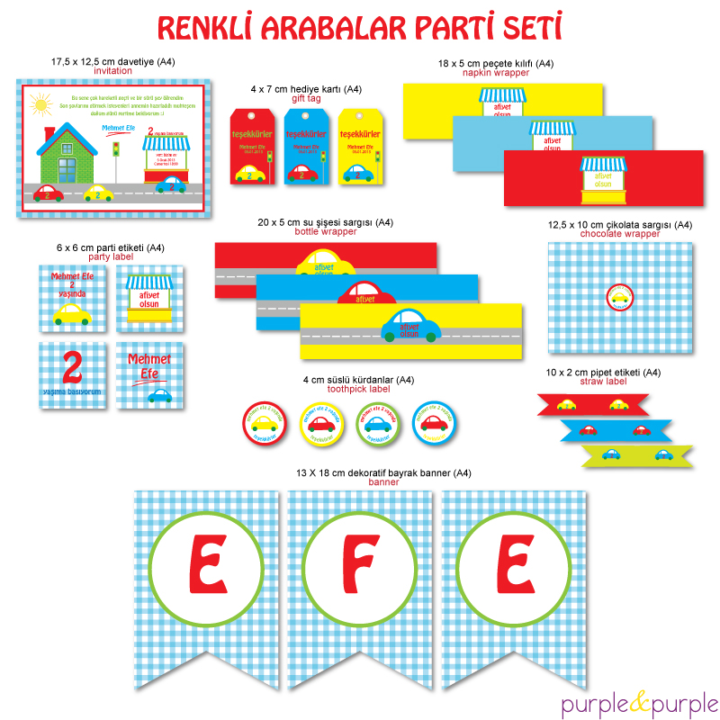 Renkli arabalar temalı parti setimiz aşağıda detaylarını belirttiğimiz 9 tasarımdan oluşuyor. Tasarımların tümünü satın alabileceğiniz gibi; sadece istediğiniz tasarımları da seçebilirsiniz. Ya da bu 9 tasarım içinden istemedikleriniz yerine ihtiyacınız olan başka parti ürünü tasarımları da ekleyebilirsiniz. Her bir tasarım A4 veya A3 sayfasına en fazla adette sığacak şekilde yerleştirilip pdf dosyası formatında mail ile gönderilir.