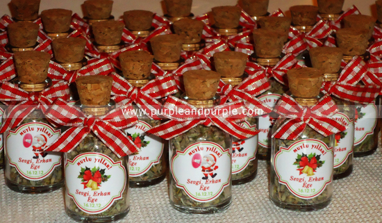 Sevgi Hanım, eşinin doğum gününü dostlarıyla birlikte erken bir yılbaşı partisi havasında kutlayacağını belirtti ve gecenin hatırası olarak bizden minik yılbaşı hediyelikleri istedi. Biz de lavantalı minik şişelerimizi yılbaşı konseptine uygun olarak tasarladık. Nice yıllara Erhan Bey, mutlu yıllar!