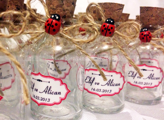 En çok tercih edilen uğur böcekli minik şişelerimizi bu sefer Ordu’ya gönderdik. Elif ve Alican’ın nişan davetinde konuklara nişan şekeri olarak dağıtılacak olan şişelerimizi kendi ürettikleri fındık yağı ile doldurmayı tercih ettiklerinden boş olarak tasarladık. Elif ve Alican’a ömür boyu mutluluklar dileriz. Minik şişelerimizin diğer çeşitleri için lütfen tıklayın.