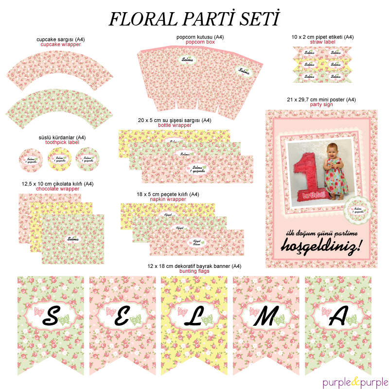 Floral (çiçek) temalı parti setimiz aşağıda detaylarını belirttiğimiz 9 tasarımdan oluşuyor. Tasarımların tümünü satın alabileceğiniz gibi; sadece istediğiniz tasarımları da seçebilirsiniz. Ya da bu 9 tasarım içinden istemedikleriniz yerine ihtiyacınız olan başka parti ürünü tasarımları da ekleyebilirsiniz.