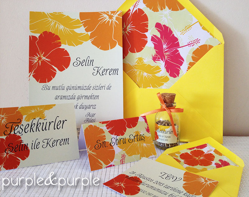 Floral temalı sarı, turuncu ve pembe tonlarında bir düğün davetiyesi tasarımını paylaşmak istiyoruz sizlerle. Yaz düğünleri için renkli ve neşeli bir alternatif olmasının yanı sıra, romantik olduğu da kesin, öyle değil mi? İçi desenli düğün zarflarının davetiyeye kattığı havayı sevdiğimiz için; sarı zarfın iç yüzünde de davetiyede yer alan büyük çiçek tasarımlarına yer verdik.