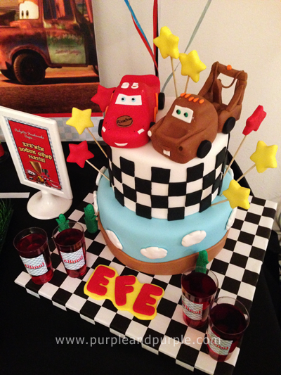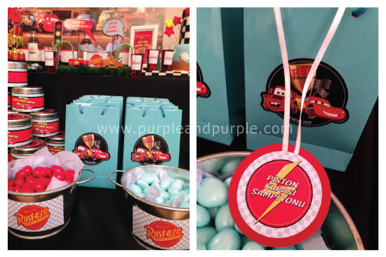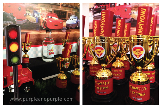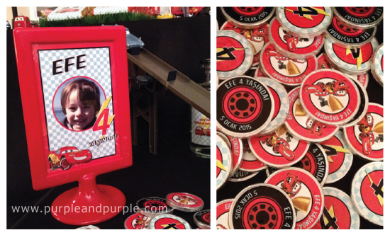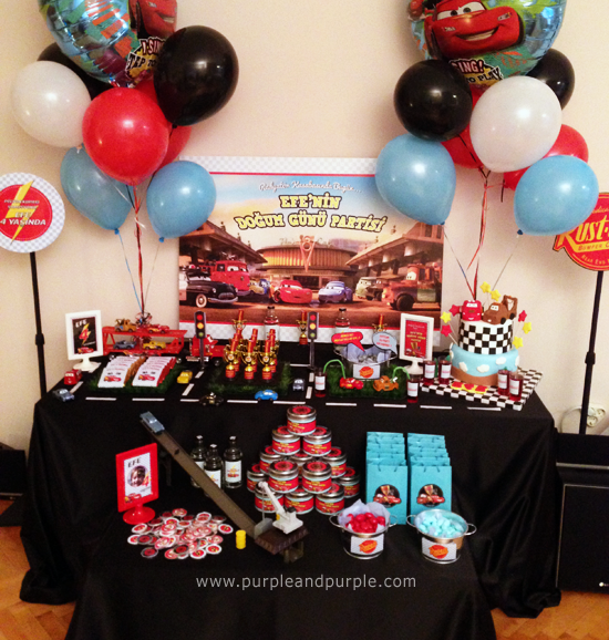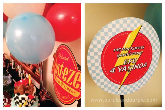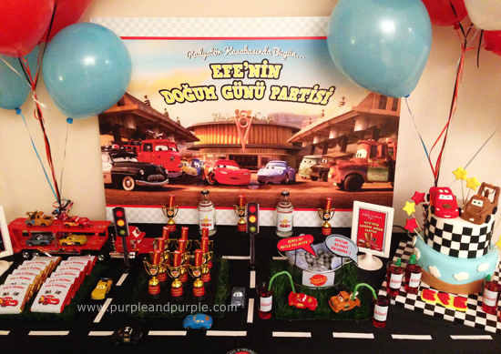 Klasik McQueen temasından daha farklı bir tasarım yapmak istedik, kırmızı ve siyahın yanına mavi rengi kattık. Arabalar (Cars 2) filmindeki Radyatör kasabası bize ilham verdi ve parti sloganımız “Radyatör kasabasında bugün: Efe’nin doğum günü partisi” oldu. Arka fonda ve masa üzerinde tüm arabaların doğum gününe katılması Efe’yi çok mutlu etti:)