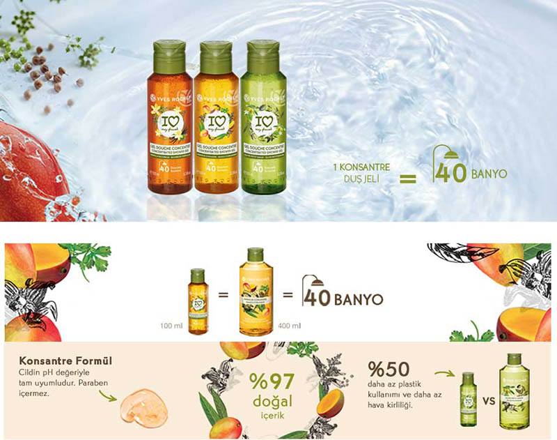 Yves Rocher’nın ürünlerini çok severim ve senelerdir aynı duş jelini kullanırım: “Malaysian Coconut” Yine aynı duş jelimi alıp mağazadan çıkacaktım ki; yeni çıkan konsantre duş jellerini gördüm. “Doğaya saygılı, cilde saygılı” sloganıyla dikkatimi çeken konsantre duş jellerinde  %50 daha az plastik kullanılmış. Üstelik paraben içermiyor ve cildin ph değeriyle de tam olarak uyumlu. Ayarlı kapağı sayesinde de ekonomik bir tüketim sağlıyor. 100 ml lik konsantre duş jeli, 400 ml lik normal bir jel şişesine denk geliyor ki bu sadece 40 banyo demek değil, tatil günlerinde valizde de dörtte bir daha az yer demek. Eski duş jelime teşekkür edip onunla vedalaştım. Doğaya ve cilde dost yeni bir duş jeli edindim. Zeytinli ve turunçlu:)