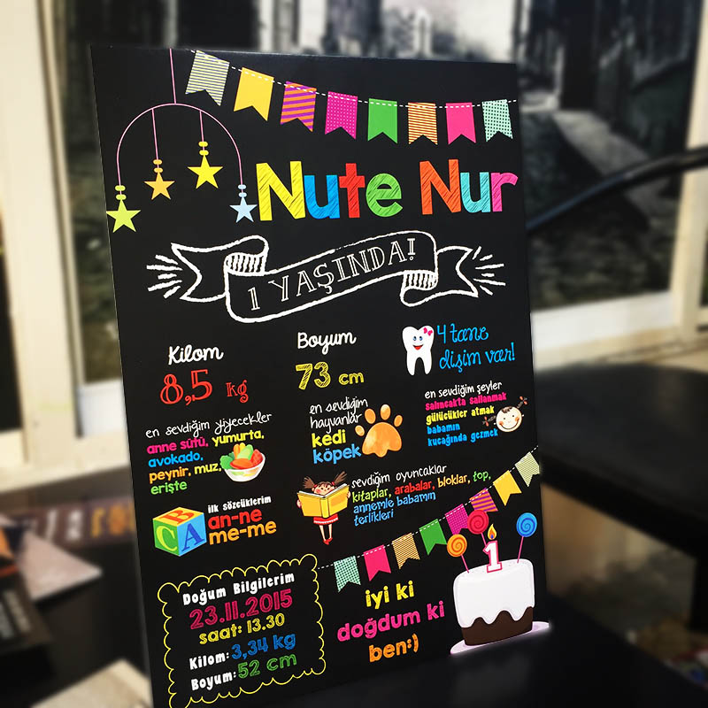 Nute Nur’un bir yaş partisi için kara tahta şeklinde bir anı panosu hazırladık. Nute Nur’un doğum bilgilerinden, ilk sözcüklerine; şu andaki boyu ve kilosundan geride kalan bir yılda kaç diş çıkardığına ve sevdiği oyunlara kadar pek çok bilgiye yer verdik. Prensesin ilk yılına ait küçük bir almanak niteliğindeki panomuzun güzel bir hatıra olacağını düşünüyor, ailesi ve sevdikleri ile birlikte sağlıklı ve mutlu, uzun bir ömür sürmesini diliyoruz:)