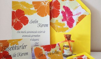 Floral temalı sarı, turuncu ve pembe tonlarında bir düğün davetiyesi tasarımını paylaşmak istiyoruz sizlerle. Yaz düğünleri için renkli ve neşeli bir alternatif olmasının yanı…
