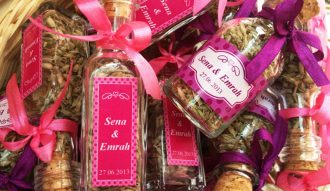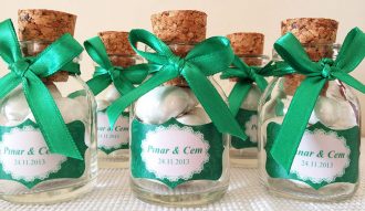 DevamıPınar Hanım, nişan töreninde konuklara hediye etmek üzere nişan şekeri olarak minik şişelerimizi tercih etti. Etiket ve kurdela tasarımını mürdüm yeşili tonlarında çalıştığımız şişelerimizin…